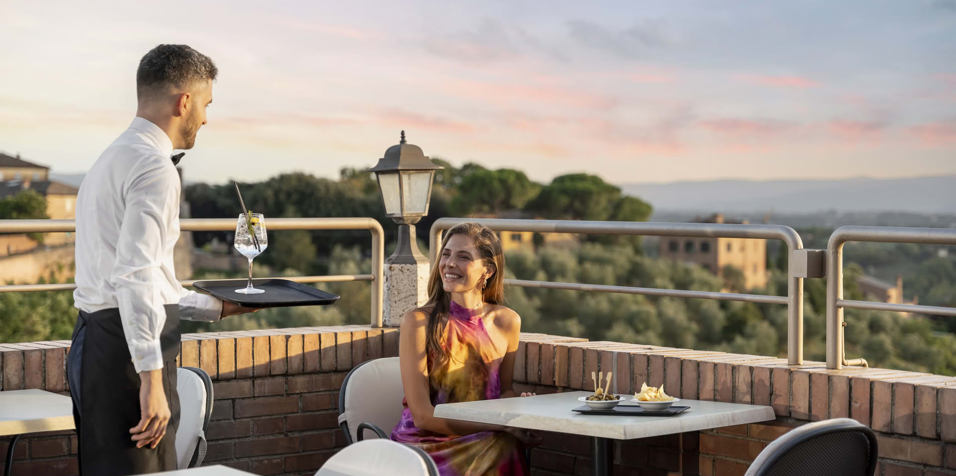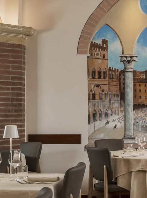 Serviamo la cena nell’accogliente sala al piano terra, arredata con caldo gusto rustico e arricchita da volte e travi a vista. In estate, è piacevolissimo cenare sulla terrazza panoramica, assaporando le prelibatezze toscane con lo sguardo che abbraccia Siena e le sue colline.